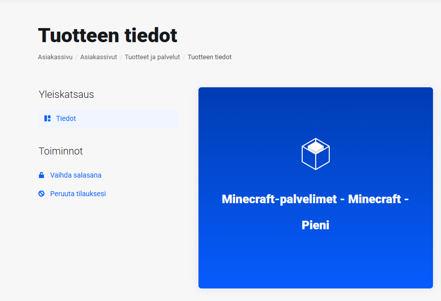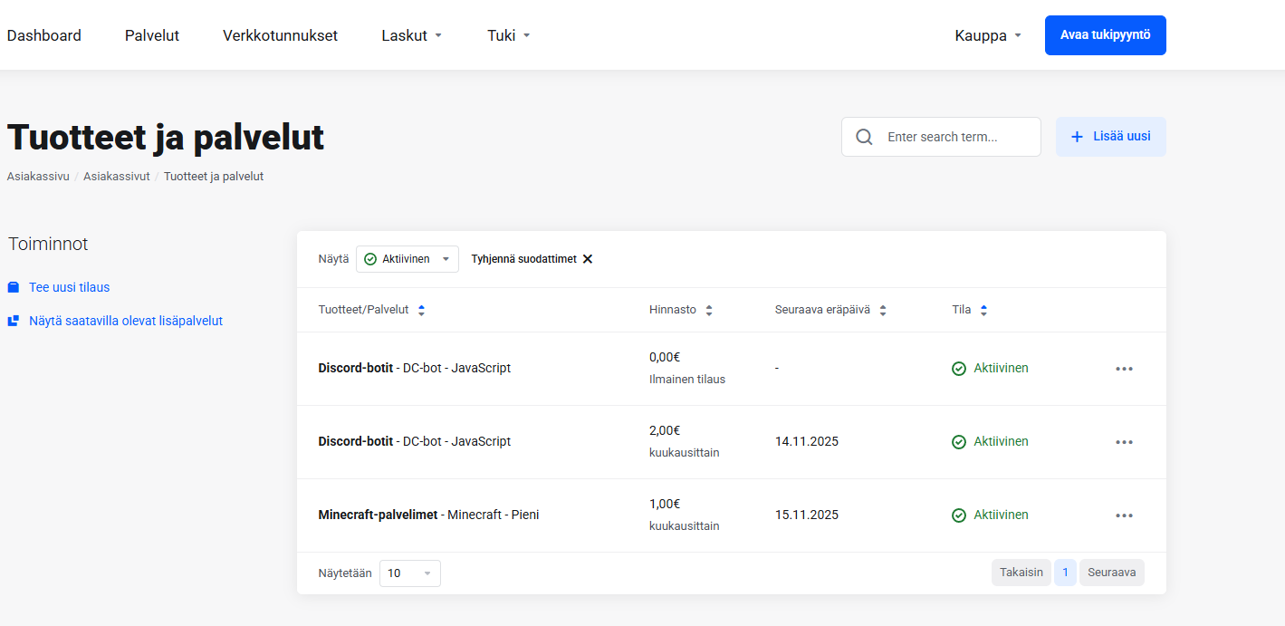 Kun olet kirjautunut asiakasalueelle, valitse "Palvelut"-välilehti jolloin sinulle aukeaa tällainen näkymä. Valitse peruutettava tuote.